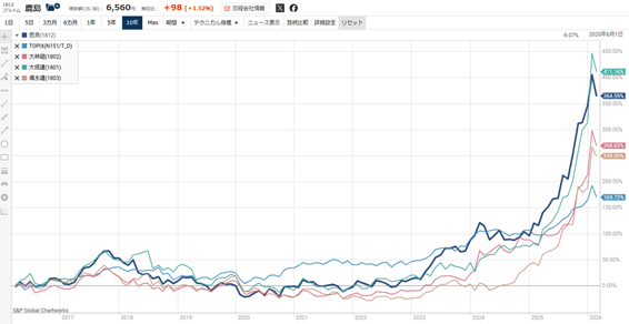 ゼネコン各社は2023年以降、株主還元強化などで株価が上昇し始め、2025年以降はTOPIXをアウトパフォームしています。10年で確認すると鹿島と大成建設の上昇が顕著です。