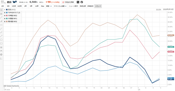 1ヶ月で見ると、実は鹿島のみがTOPIXをアンダーパフォームしています。2月に発表した2026年3月期第三四半期決算は受注高を上方修正するなど、決して悪くない状況でしたが、それまでの株価の上昇が著しかったゆえ、いったん利益確定された形でしょうか。